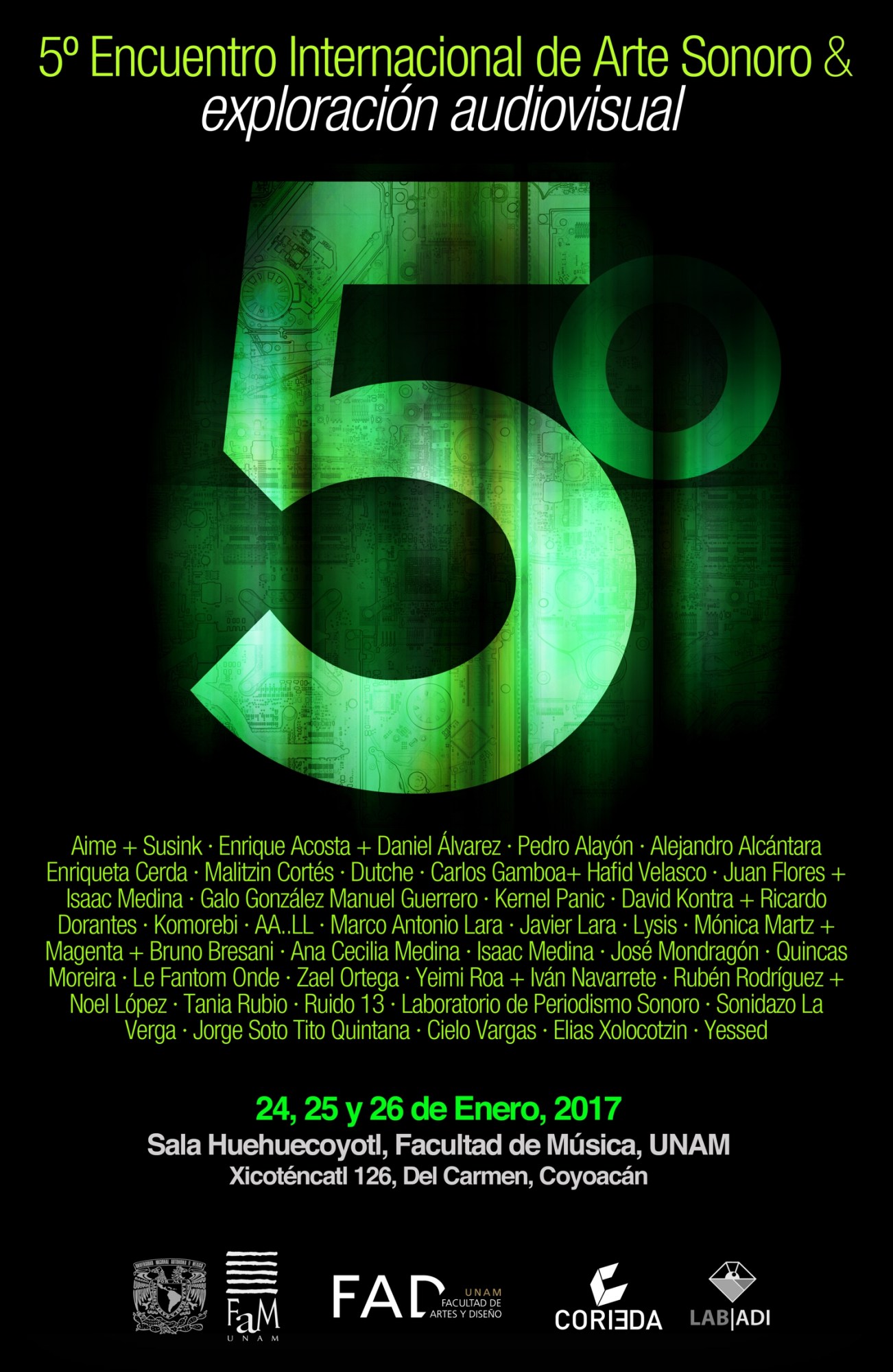2017. Presentación de obra en el 5° Encuentro Internacional de Arte Sonoro & Exploración Audiovisual organizado por la Facultad de Música de la UNAM.