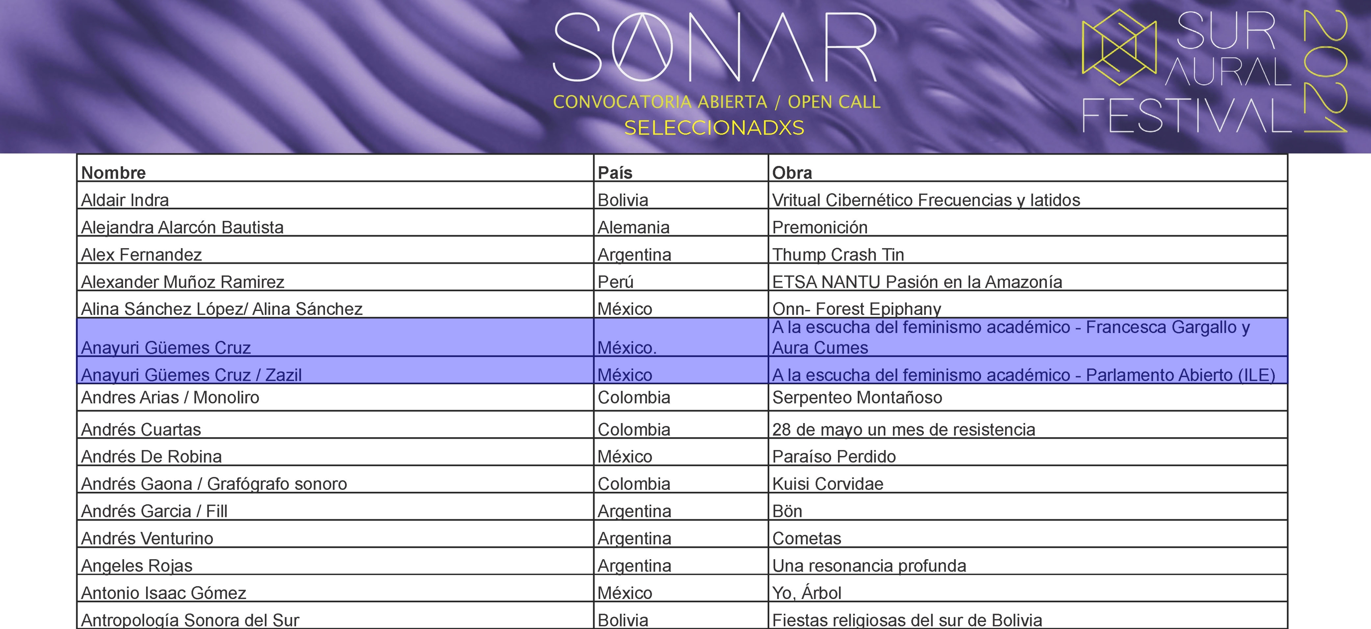 2020. Presentación en el festival Sur Aural (Bolivia) de dos obras sonoras dedicadas a dos poetas indígenas: Cruz Alejandra Lucas (Puebla) y Martín Tonalmeyotl (Guerrero).