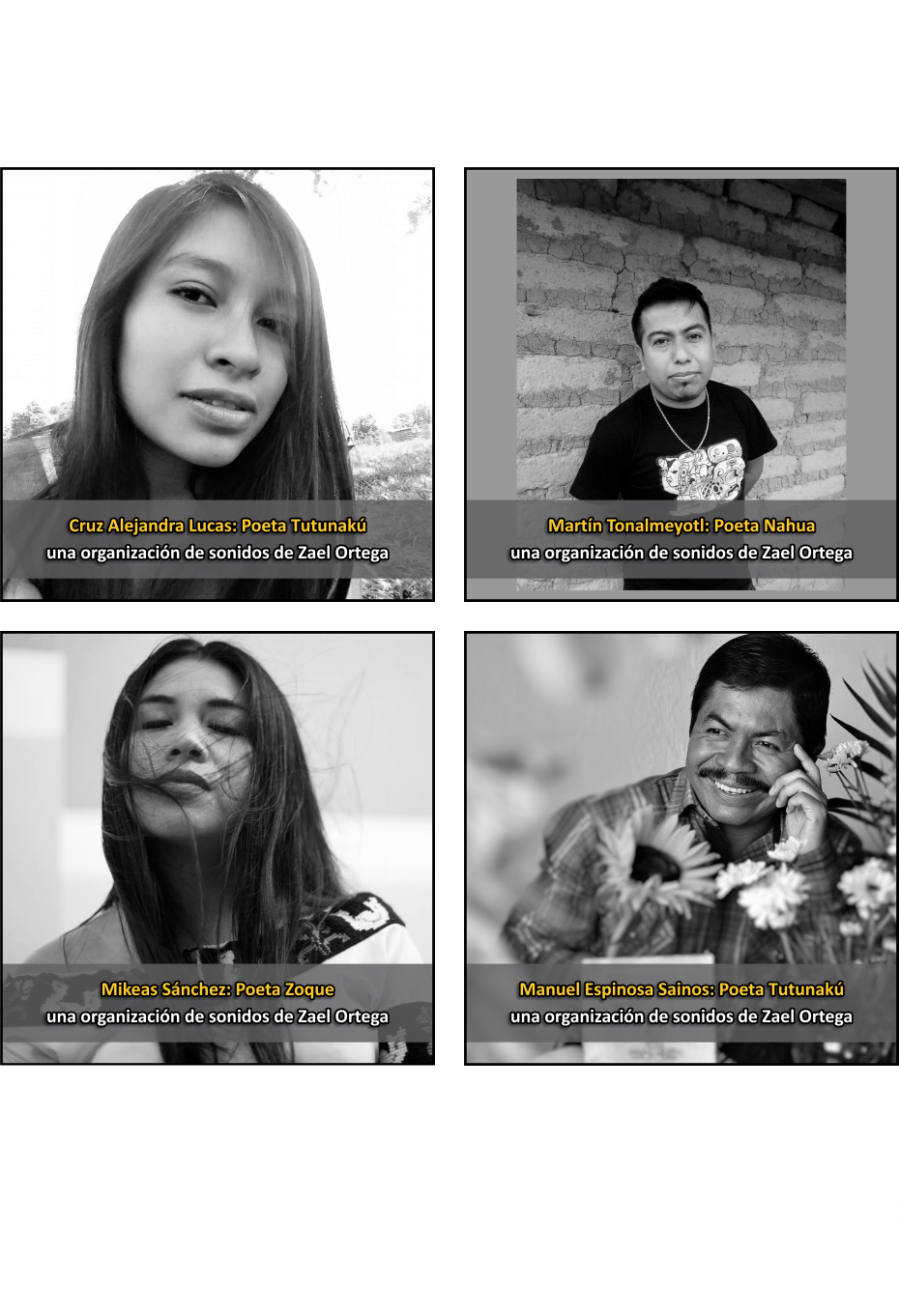 También nos da mucho gusto poder compartirte que Aprender a Escuchar: Creación Sonora sobre Poesía Originaria forma parte del proyecto Gusanos de la Memoria una iniciativa mé`phàà autogestiva que trabaja para incentivar la creación literaria, recuperación de la memoria oral, audiovisual y fotográfica de las culturas originarias de la Montaña de Guerrero.