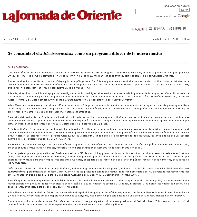 • Oídos de Acero formó parte de la presentación del proyecto internacional Radioartnet (del cual Zael Ortega también es miembro) en Ars Sonora de Radio Clásica en Radio Nacional de España.