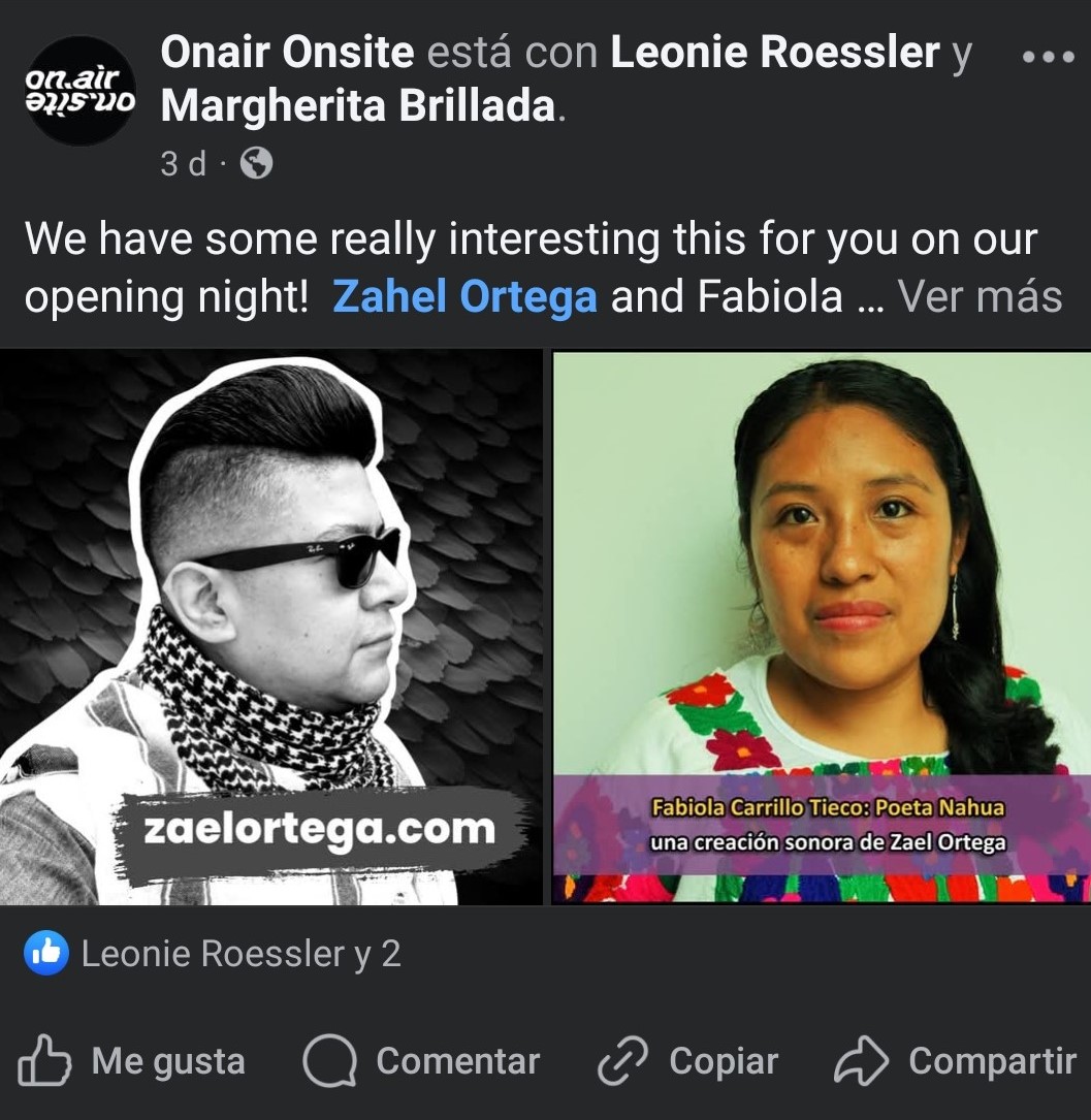 Fabiola Carrillo Tieco: Poeta Nahua y Ethel Xochitiotzin Pérez: Poeta Nahua, obras de Zael Ortega, fueron presentadas en ON AIR – ON SITE: un festival especializado en arte radiofónico con sede en La Haya (Países Bajos) y en asociación con el Instituto de Sonología también de La Haya (Países Bajos)
