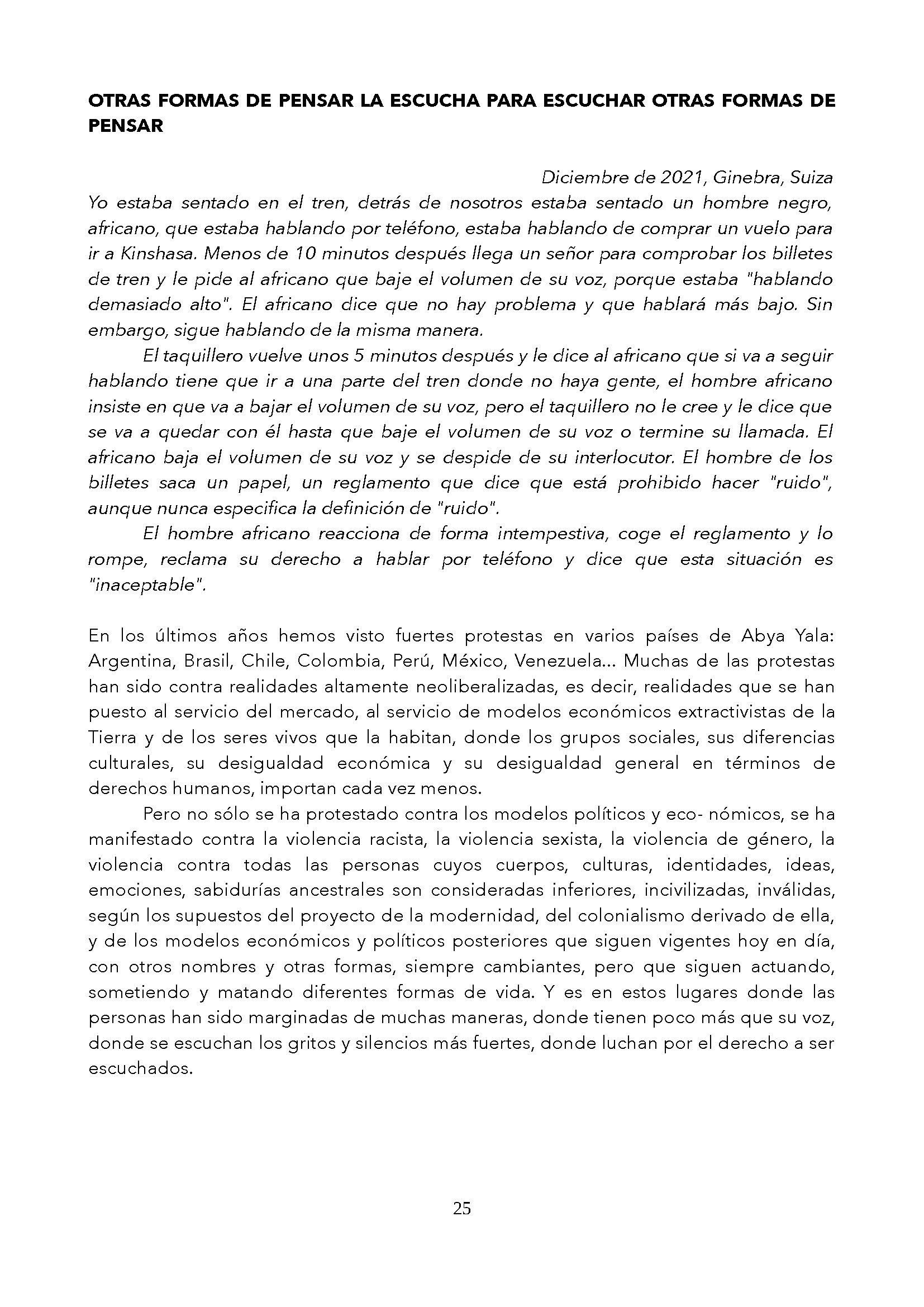 * Se cuestiona la capacidad de las culturas hegemónicas para escuchar discursos subalternos y se propone una reflexión sobre la escucha.